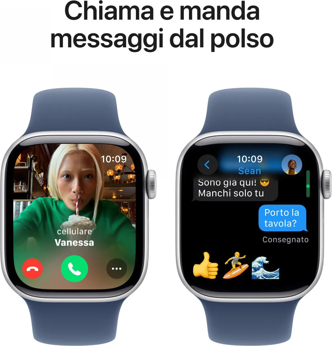 - SEMPRE IN CONTATTO - Manda messaggi, rispondi a una chiamata, ascolta musica e podcast, usa Siri e leggi le notifiche ovunque sei. Insieme al tuo iPhone o sotto rete Wi-Fi, Apple Watch Series 10 (GPS) ti tiene in contatto col mondo.