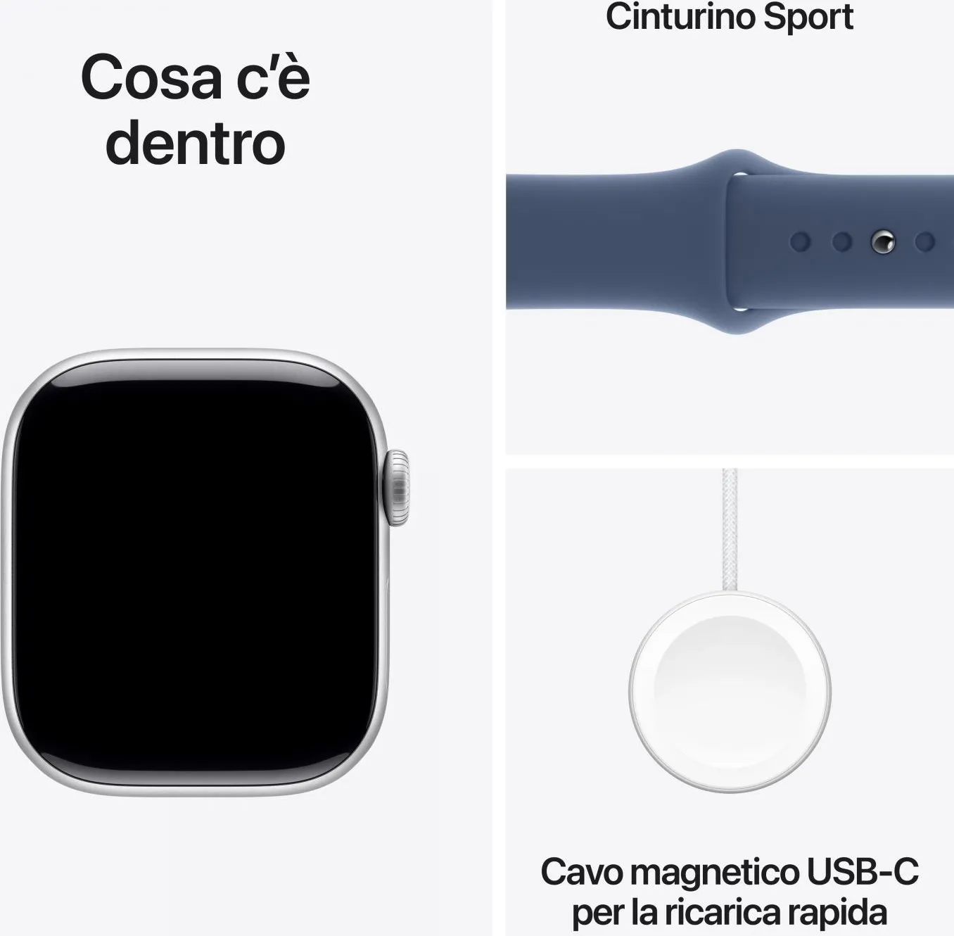 Watch Series 10, 42mm, GPS, OLED, Always-on altimeter, Digital Crown, watchOS 11. Apple Watch Series 10 Serie 10 GPS 42mm Cassa in Alluminio Color Argento con Denim Sport Band - S/M, OLED, Touch screen, 64 GB, Wi-Fi, GPS (satellitare), 30 g