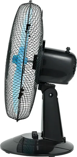 Ventilatore da tavolo Ø 40 cm, pala colorata in semitrasparenza turchese. 5 pale, griglia a nido d'ape, oscillazione laterale automatica. Inclinazione verticale. Potenza 50W, 3 velocità, look total black.