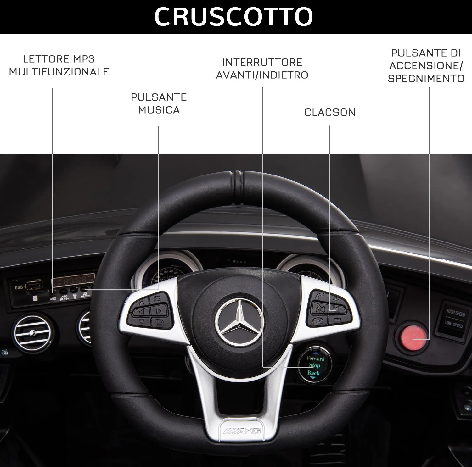 Accendi i motori e fai sfrecciare i più piccoli a bordo della macchina elettrica per bambini a marchio Mercedes! Dotata di fari, sedile con cintura di sicurezza e volante con cruscotto, questa auto elettrica per bambini regala un'esperienza di guida realistica. In più, è presente un telecomando che i genitori possono utilizzare per controllare il funzionamento della macchina elettrica.Caratteristiche: