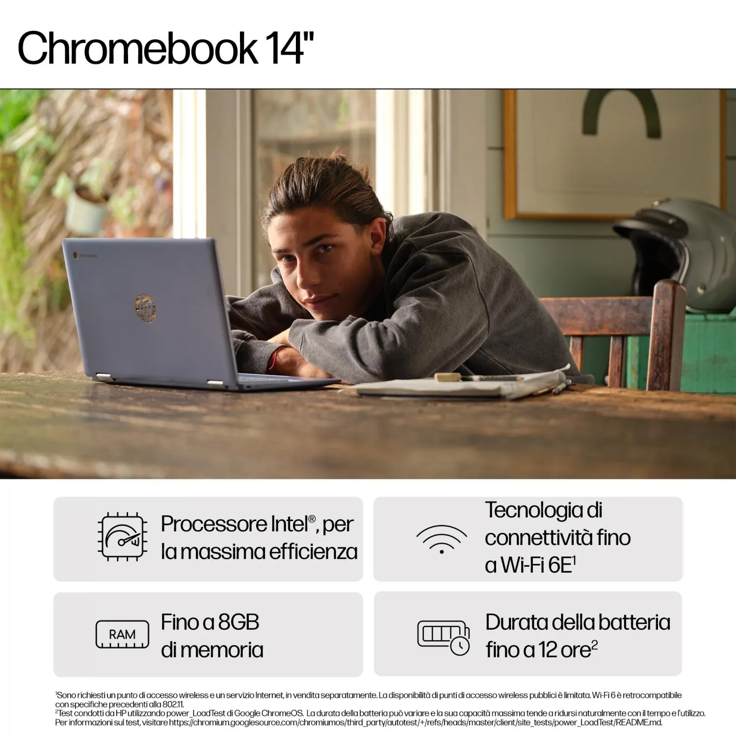 Aumenta produttività ed efficienza con HP Chromebook 14", che offre le prestazioni di un processore fino a Intel[1] e la facilità di utilizzo di Chrome OS. Vai oltre ogni limite con un ampio storage, velocità superiori e connettività wireless[2], avvio più rapido ed elevata autonomia con HP Fast Charge[3], per restare connessi per tutta la giornata.