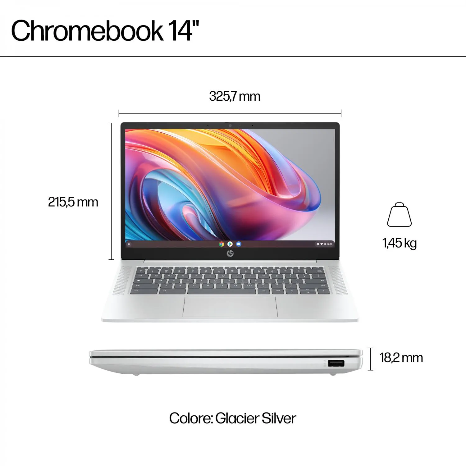 HP Chromebook 14a-nf0001nl. Tipo di prodotto: Chromebook, Fattore di forma: Clamshell. Famiglia processore: Intel® N, Modello del processore: N100. Dimensioni diagonale schermo: 35,6 cm (14"), Tipologia HD: Full HD, Risoluzione del display: 1920 x 1080 Pixel. RAM installata: 8 GB, Tipo di RAM: LPDDR5-SDRAM. Capacità totale di archiviazione: 128 GB, Supporto di memoria: eUFS. Modello scheda grafica integrata: Intel® UHD Graphics. Sistema operativo incluso: ChromeOS. Colore del prodotto: Grigio. Peso: 1,45 kg